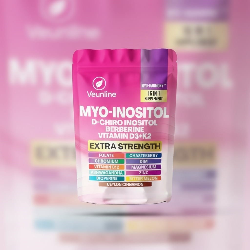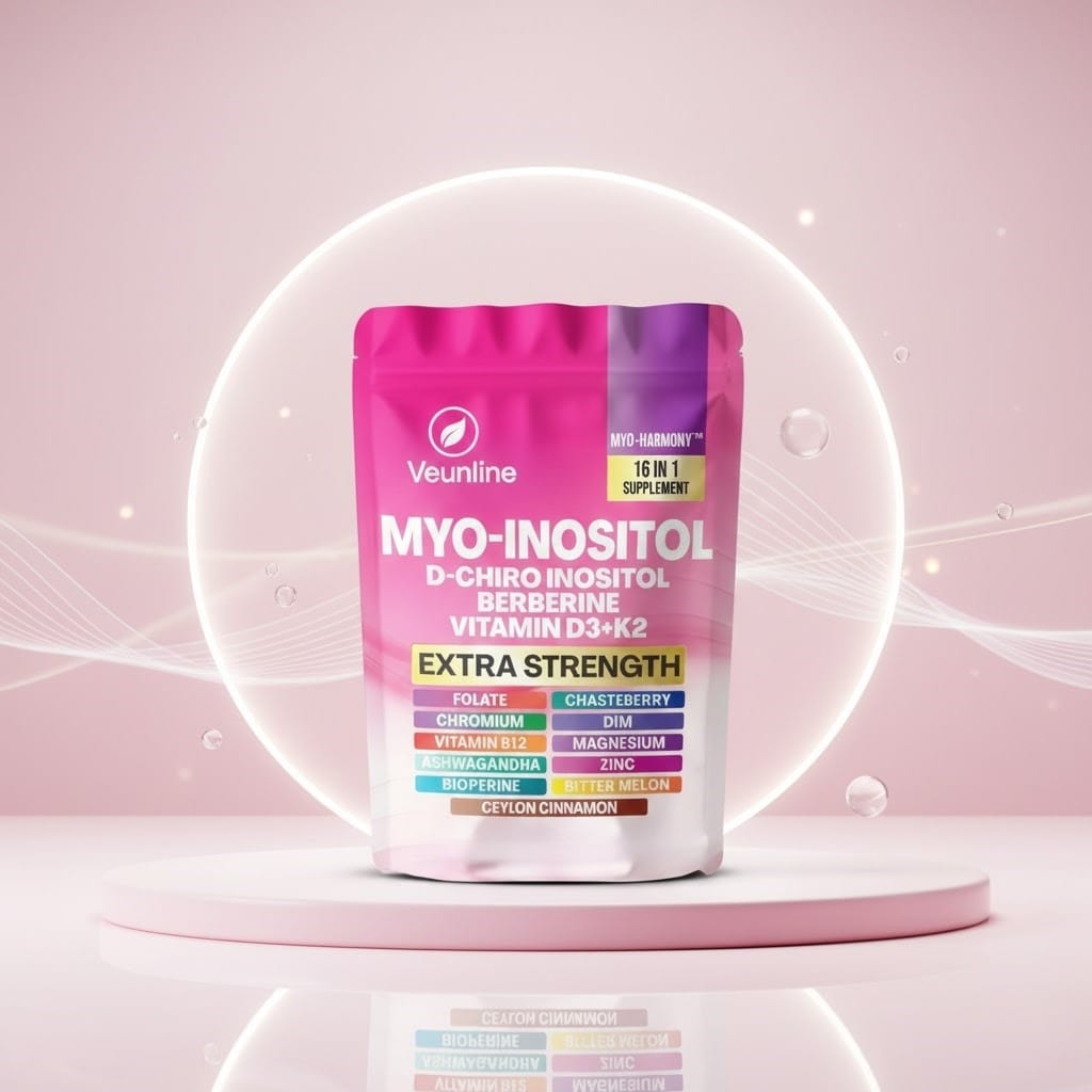A clean and wellness-focused showcase highlighting the all-in-one hormonal support, nutrient richness, and premium formulation of Veunline™ 16-in-1 Hormone Gummies.